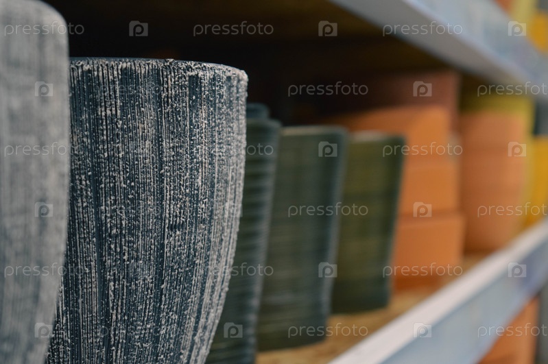 Различные пустые горшки для домашних цветов на полке магазина выстроены в ряд