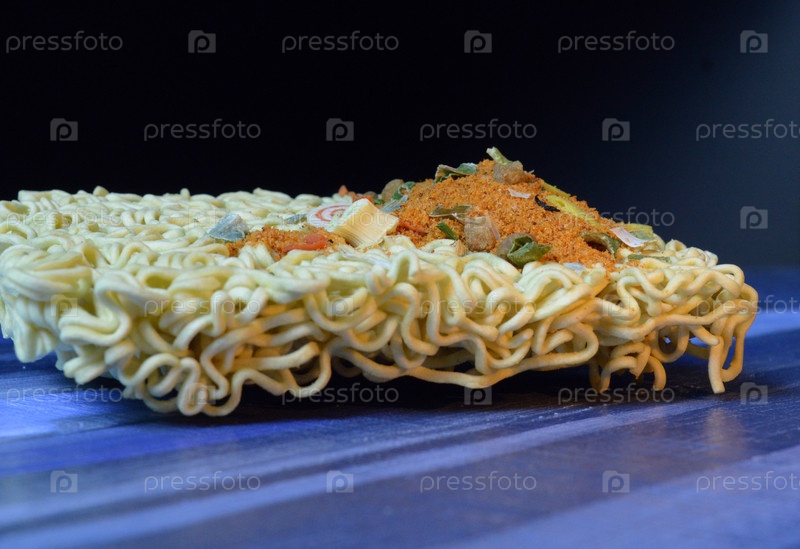 Лапша быстрого приготовления или спагетти химического типа на синем фоне, посыпанные сверху приправой и усилителем вкуса