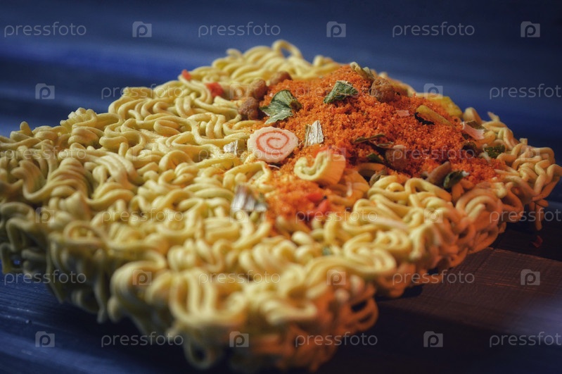 Лапша быстрого приготовления или спагетти химического типа на синем фоне, посыпанные сверху приправой и усилителем вкуса