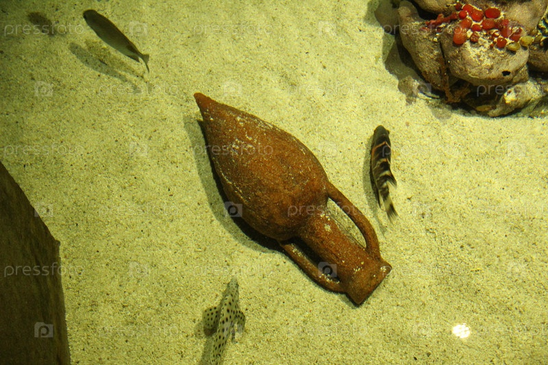 Амфора на песке в воде. Древний кувшин в аквариуме. Ископаемое