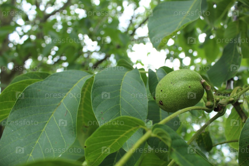 Растущие орехи. Крупный план плодов грецкого ореха на фоне зеленых листьев