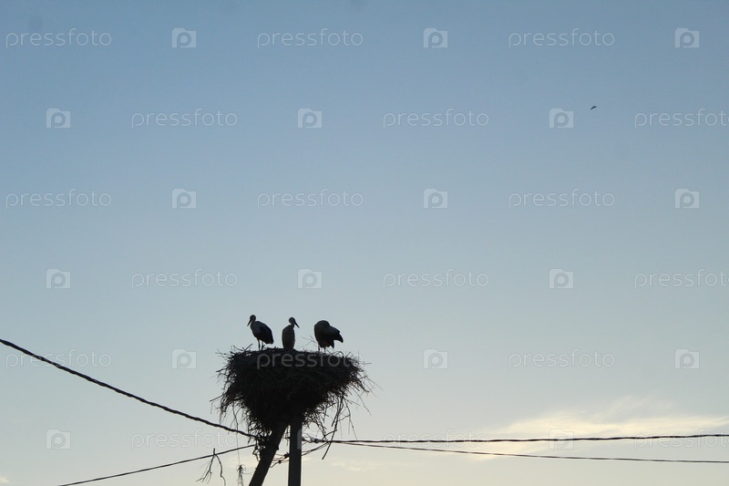 Аисты в гнезде, силуэты птиц на фоне светло-голубого неба возле электрических проводов