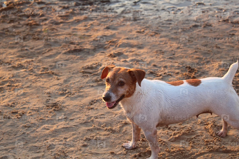 Собака на пляже породы Джек Рассел на песке на закате. Прогулки с домашними животными
