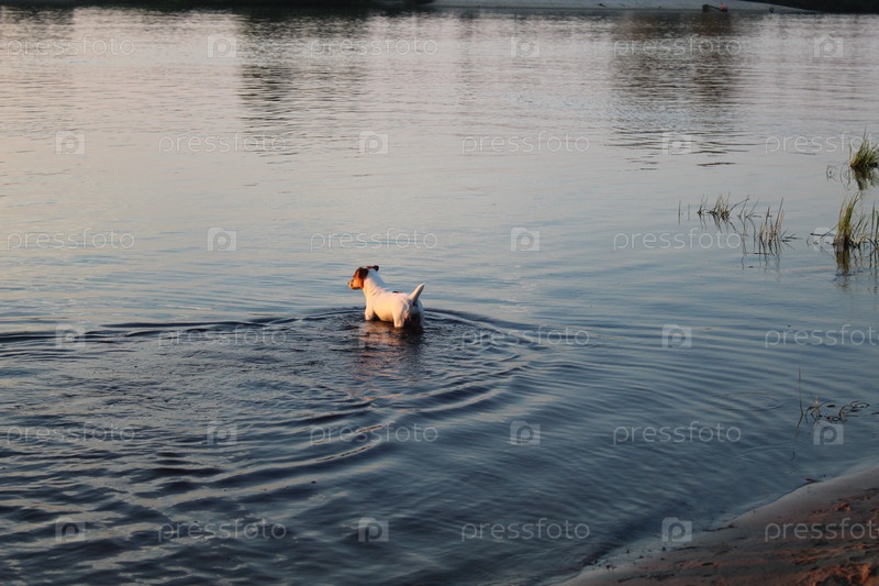 Собака плавает в озере реки. Покупка и выгул домашних животных, собак
