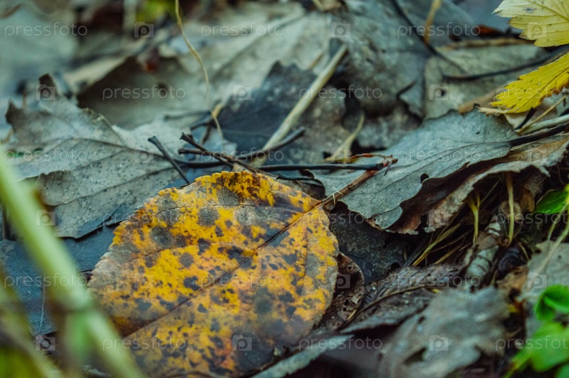 Осенний желтый лист с коричневыми крапинками лежит на земле среди уже почерневших листьев. Лист — долгожитель, который слетел с дерева позже всех остальных