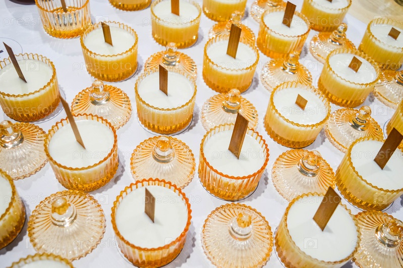 Процесс изготовления декоративных ароматических свечей с деревянным фитилем для дома. Свечи ручной работы в прозрачных стеклянных горшках