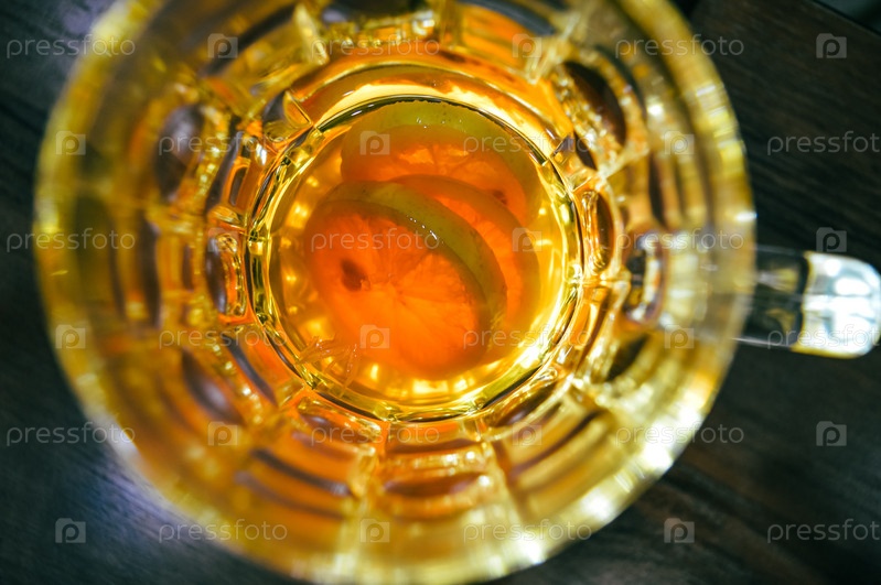 Красивый яркий напиток в прозрачной стеклянной кружке с лимонами на дне в стиле глинтвейна или горячего чая. Сочный желтый цвет и красивый узор в круге позволят использовать изображение в качестве баннера-заставки или приглашения