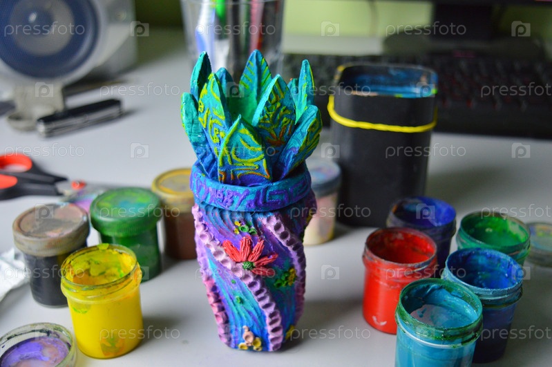 Красивая керамическая ваза в стиле бохо-морской после росписи акрилом и гуашью стоит для просушки на столе в гончарной мастерской