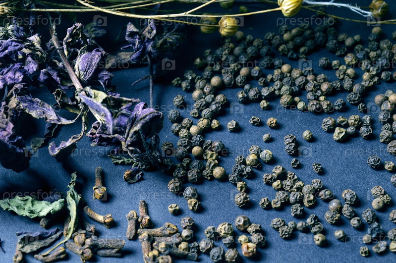 Различные специи, разбросанные на темном фоне с пучками травы, лавровыми листьями, ягодами и другими специями для приготовления ароматных блюд Востока и Среднего Запада
