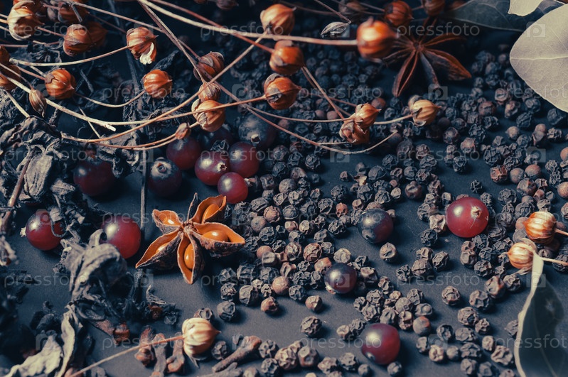 Различные специи, разбросанные на темном фоне с пучками травы, лавровыми листьями, ягодами и другими специями для приготовления ароматных блюд Востока и Среднего Запада