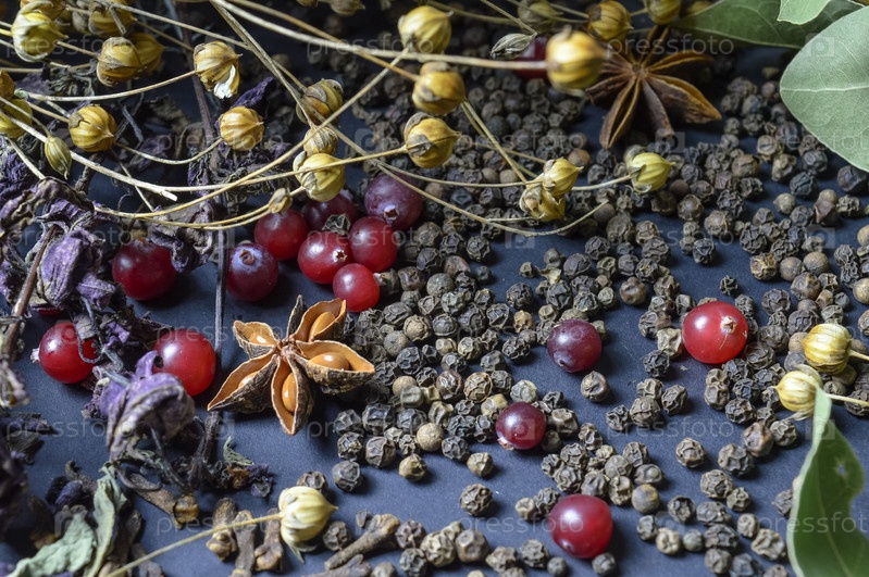 Различные специи, разбросанные на темном фоне с пучками травы, лавровыми листьями, ягодами и другими специями для приготовления ароматных блюд Востока и Среднего Запада