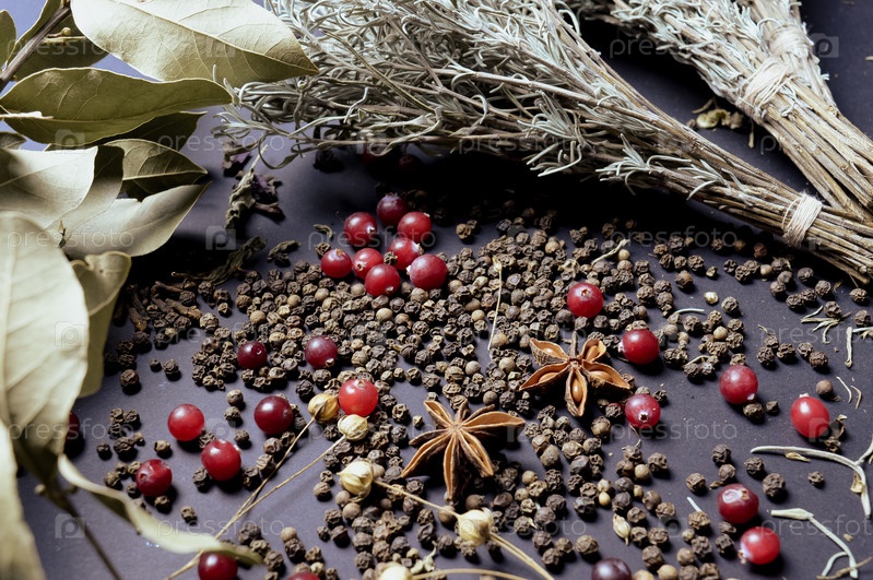 Различные специи, разбросанные на темном фоне с пучками травы, лавровыми листьями, ягодами и другими специями для приготовления ароматных блюд Востока и Среднего Запада