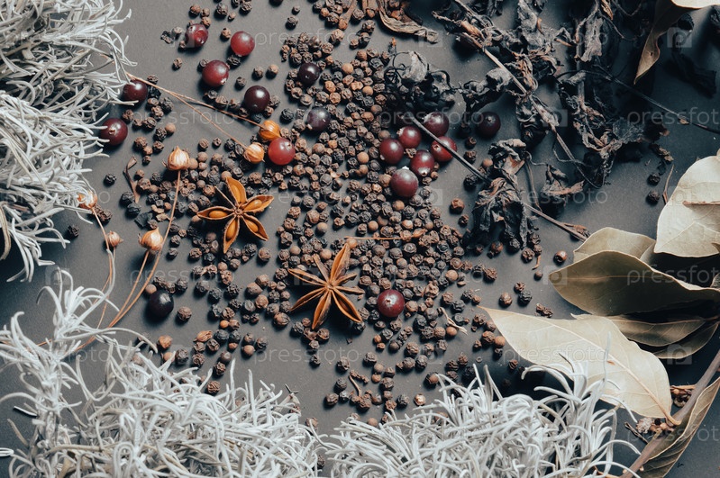 Различные специи, разбросанные на темном фоне с пучками травы, лавровыми листьями, ягодами и другими специями для приготовления ароматных блюд Востока и Среднего Запада