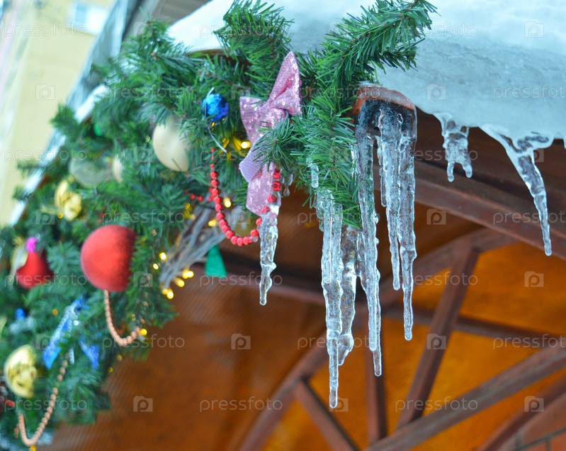 Новогодняя рождественская хвойная гирлянда на открытом воздухе замерзла и покрылась свисающими сосульками