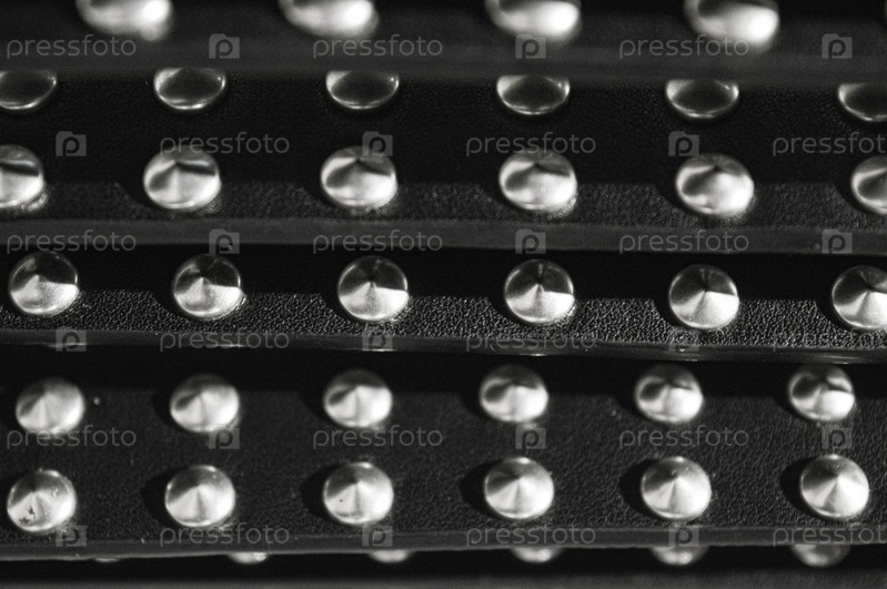 Абстрактный фон из кожи и металла с вкраплениями черной бычьей шкуры и блестящими металлическими заклепками в стиле байкеров и любителей рок-н-ролла 80-х и 90-х годов