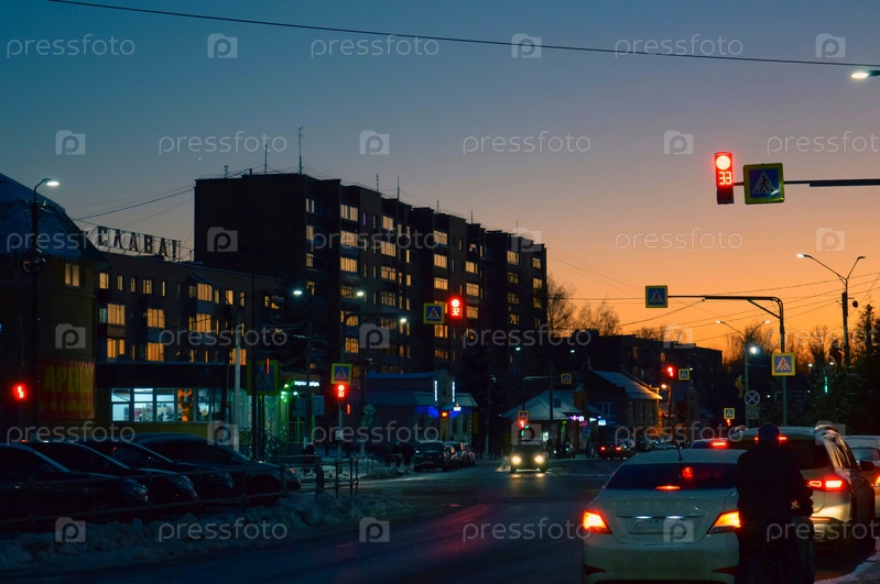 Городской трафик на закате в сумерках. Все фирменные наименования и логотипы удалены. В городе вечерняя суета ноября, оранжевое небо и отражение заката в окнах многоэтажных домов