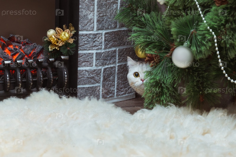 Белый британский кот с желтыми глазами выглядывает из-под рождественской елки возле камина