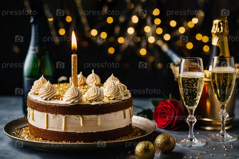 Праздничный стол ко дню рождения с тортом и шампанским, торт со свечкой на тарелке, натюрморт с двумя бокалами шампанского