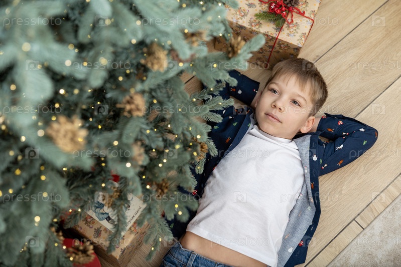 Россия. Санкт-Петербург. Ребёнок лежит под елкой Нового года. Россия. Санкт-Петербург. Ребенок лежит под рождественской ёлкой
