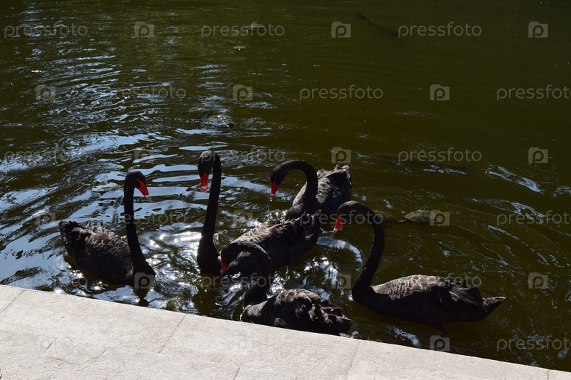 Пять черных лебедей в воде в парке 'Южные культуры' в АдлереПять чёрных лебедей в воде в парке Южных культур в Адлере