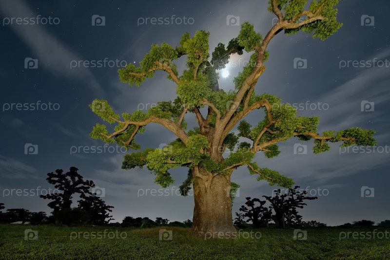 Западная Африка. Сенегал. Лунная ночь над рощей гигантских баобабов в долине реки Ла Симон недалеко от города Нгекхох