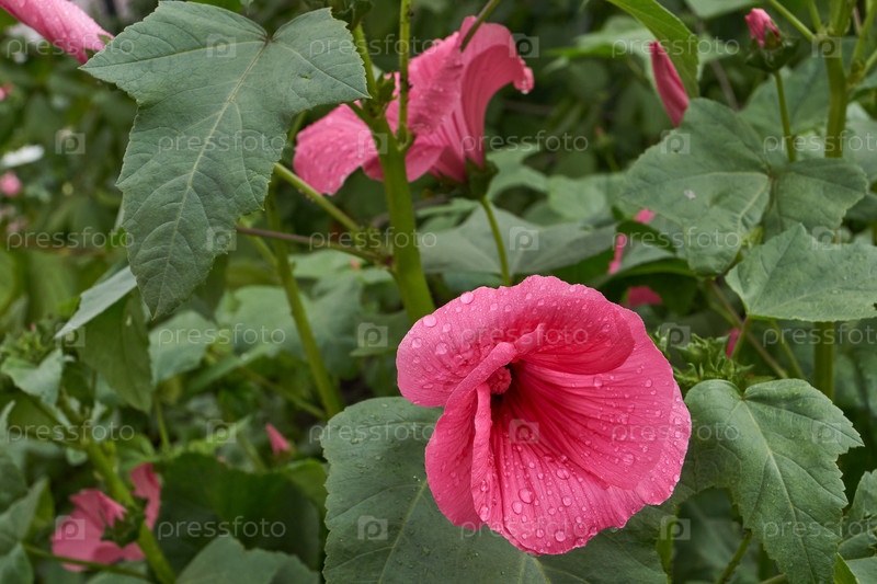 Цветки лаватера в крупном плане после дождя.Лаватара цветет на лужайке в саду