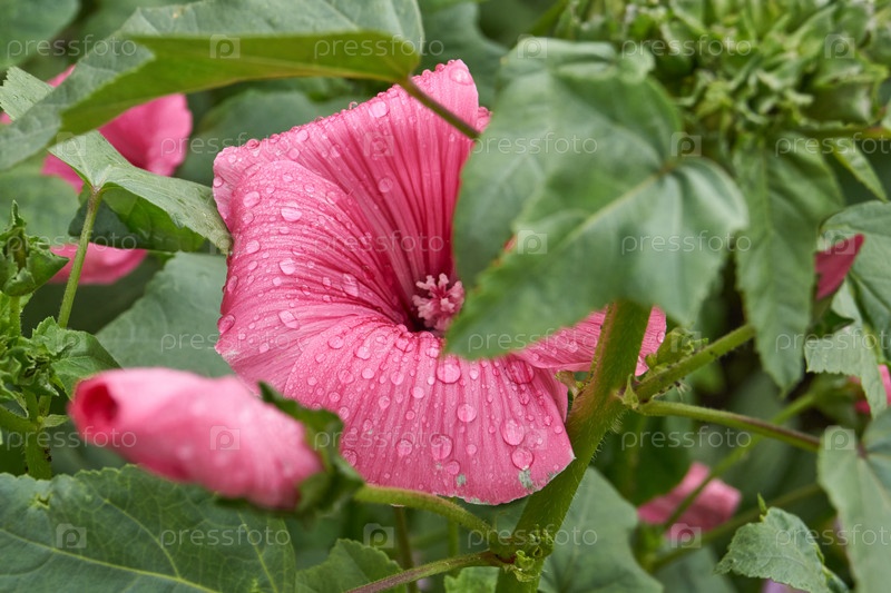 Цветки лаватера в крупном плане после дождя.Лаватара цветет на лужайке в саду