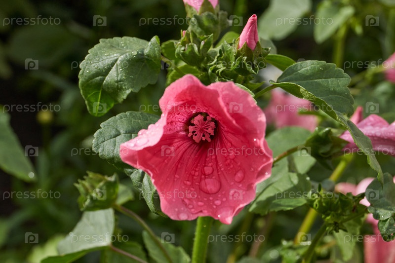 Цветки лаватера в крупном плане после дождя.Лаватара цветет на лужайке в саду
