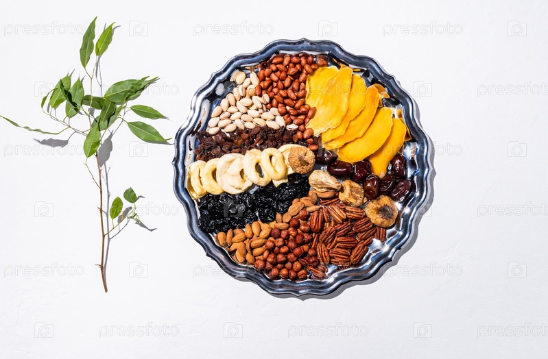 Красивое серебряное блюдо с различными сухофруктами и орехами на белом фоне с зеленой веткой дерева. Вид сверху. Концепция Ту Би Шват