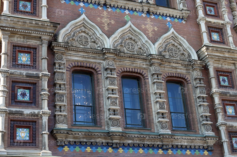 Окна храма Воскресения Христова на Крови в Санкт-Петербурге обрамлены оригинальными резными каменными наличниками