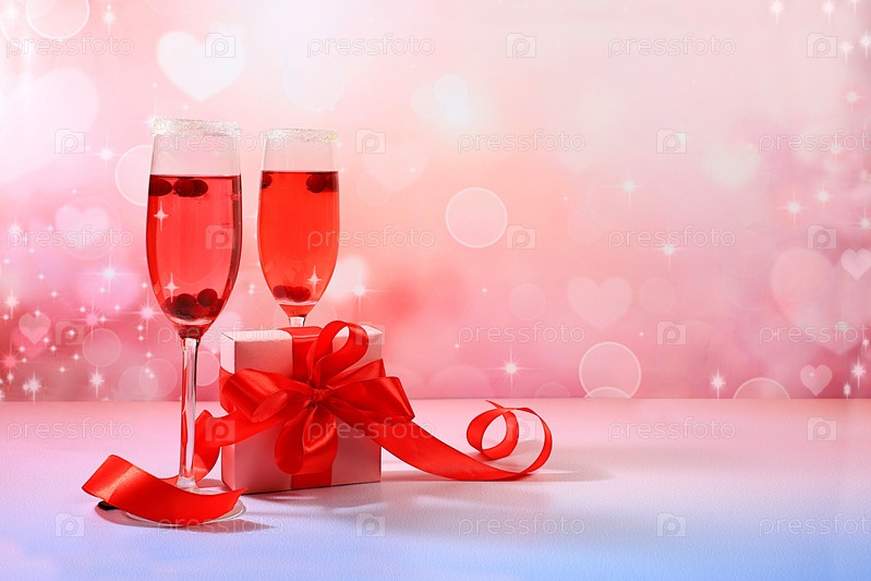 Праздничный алкогольный коктейль «Мимоза» с клюквой в бокалах и подарочной коробке, концепция Дня святого Валентина, алкогольные напитки на вечеринке, реклама баров и ресторанов, выборочный фокус
