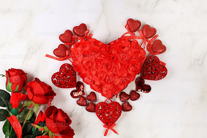 День святого Валентина или женский день, баннер празднования Дня матери. Поздравительная открытка, набор красных сердец на мраморном фоне с розами, поздравления с праздником, днем рождения,