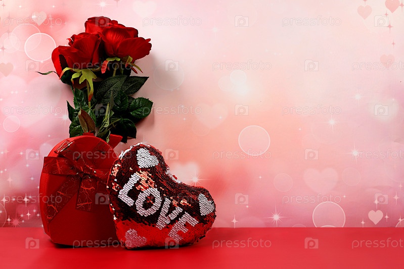 День святого Валентина или женский день, концепция Дня матери, баннер. Поздравительная открытка с розами, сердцами и подарочными коробками на красном фоне, с праздником, поздравления с днем рождения,