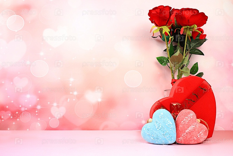 Поздравительная открытка с розами, сердечками и подарочными коробками на красном фоне. Концепция ко Дню святого Валентина или женскому дню, Дню матери, баннер, счастливый праздник, поздравления с днем рождения,