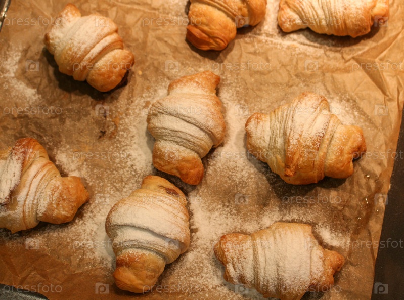 Маленькие круассаны, посыпанные сахарной пудрой. домашняя выпечка