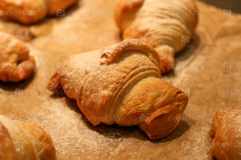 Золотистый шоколадный круассан на пергаментной бумаге крупным планом
