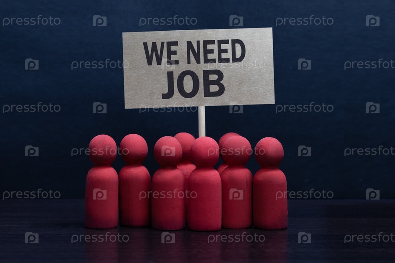 Концепция безработицы. Деревянные фигуры людей держат плакат с надписью «нужна работа»
