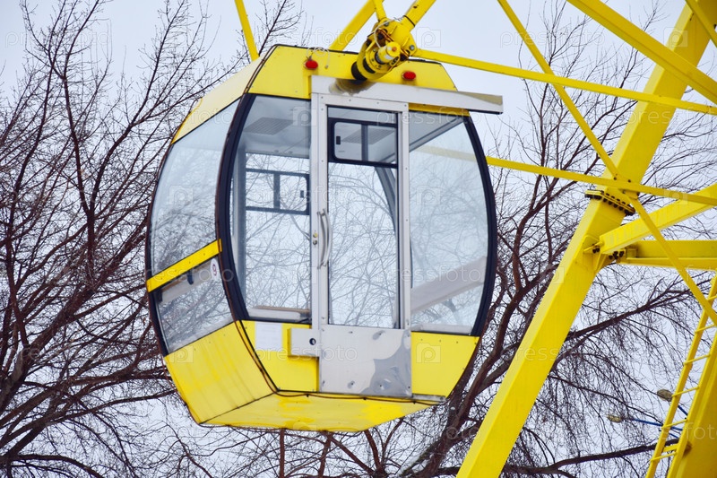 Желтое колесо обозрения, закрытая кабинка в детском парке "Фанни парке" зимой на фоне неба