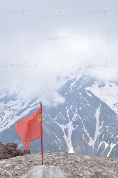 Вид на горы со смотровой площадки станции Мир (3500 метров) канатной дороги горы Эльбрус: заснеженные вершины в облаках, грязный снег, советский флаг