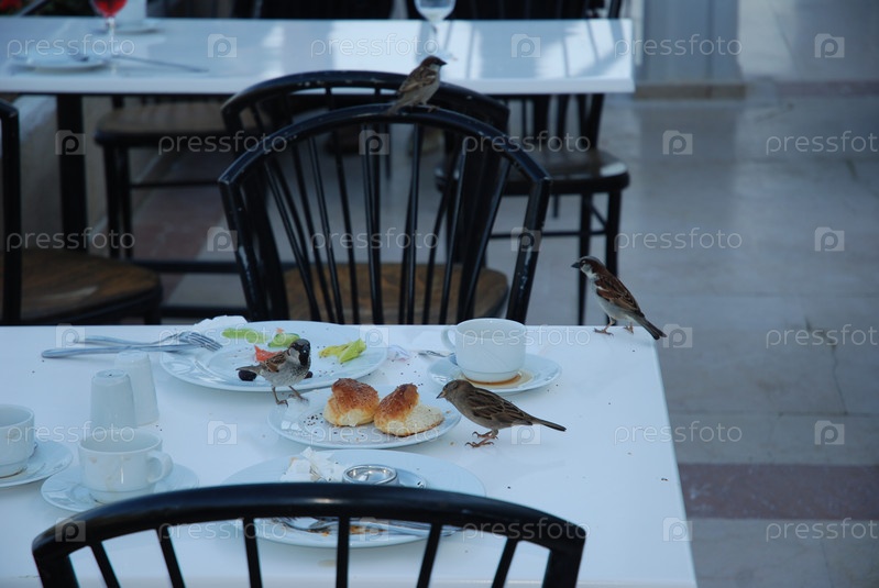 Воробьи на столе в ресторане едят хлеб