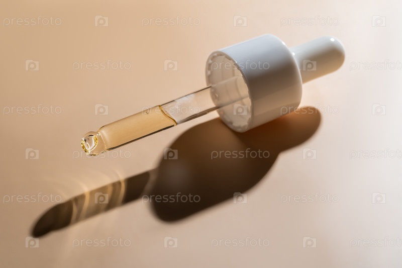 Косметическая пипетка с сывороткой на бежевом фоне. Пипетка-капличка для масла для лица. Текстура косметического продукта для лица Beauty. Лосьон по уходу за телом