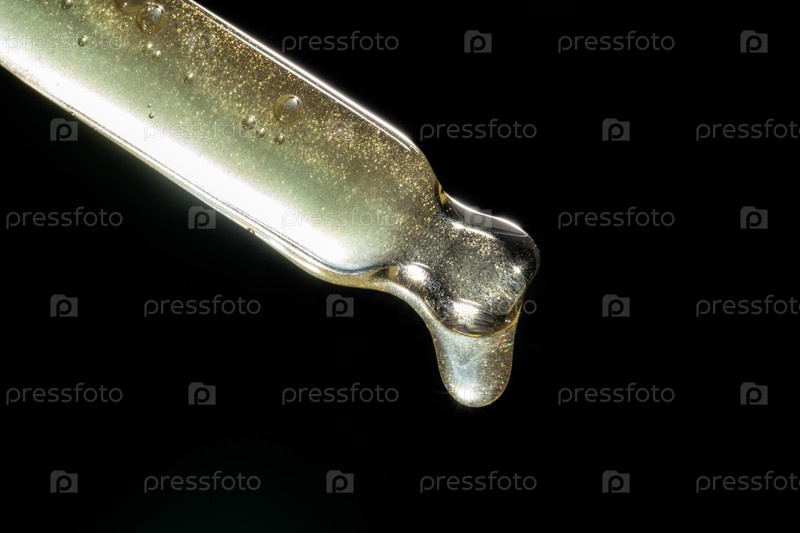Фон красоты с пипеткой и жидким средством по уходу. Пипетка с золотой сывороткой, эмульсией, гиалуронкой на черном фоне