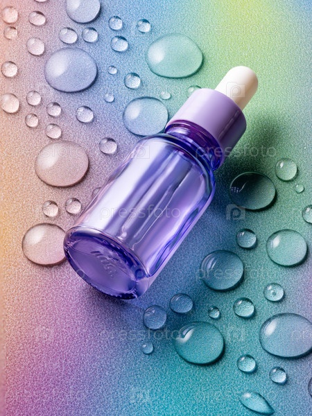 Фиолетовый флакон для эфирного масла для лица или сыворотки на многоцветном градиентном фоне с большим количеством капель воды. Косметический продукт для концепции ухода за кожей. Минимальный и роскошный стиль