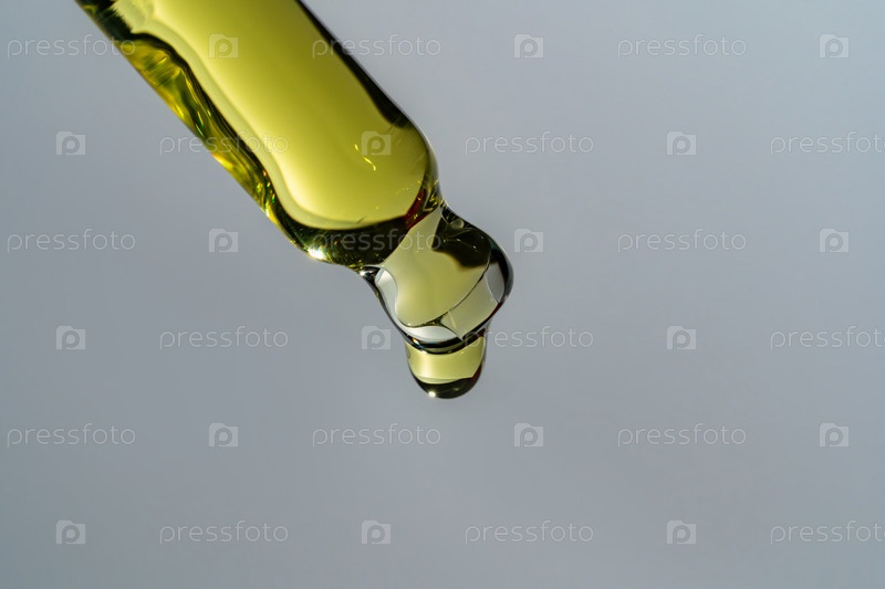 Бутылка пипетка капельница крупным планом и жидкий желто-оранжевый ретинол или витамин С гель или сыворотка на сером фоне