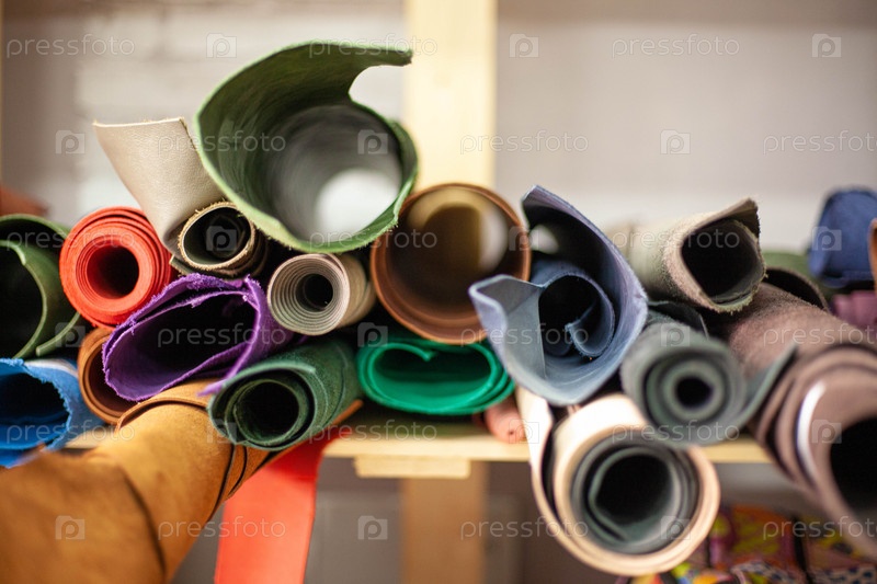 На полке кожевенной мастерской лежат рулоны разноцветной кожи для изготовления сумок, кошельков и других кожаных аксессуаров