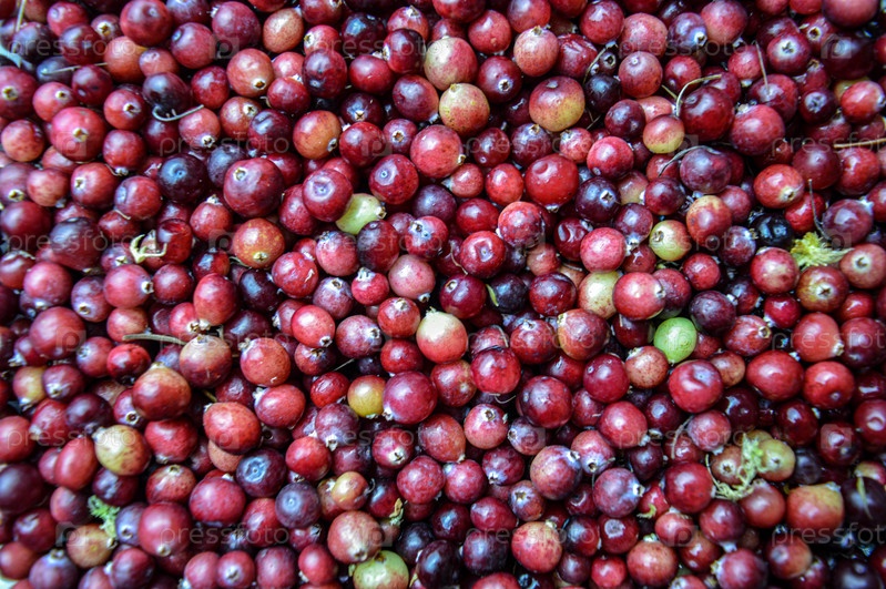 Сплошной ягодный фон из клюквы, выложенной на плоскости. красно-бордовые и желтые ягоды разной степени созревания, натуральные лесные ягоды, выращенные на моховых болотах Европы