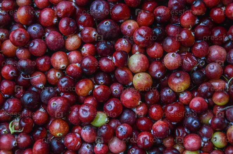 Сплошной ягодный фон из клюквы, выложенной на плоскости. красно-бордовые и желтые ягоды разной степени созревания, натуральные лесные ягоды, выращенные на моховых болотах Европы