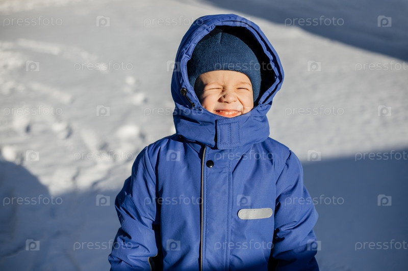 Зимой мальчик щурится и улыбается, потому что солнце светит ему в глаза. Холодная зима, тепло одет в синий комбинезон и шапку