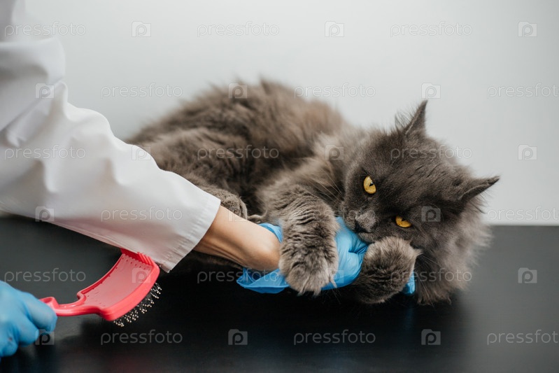 Пушистый серый кот не хочет, чтобы его шерсть чистил врач в ветеринарной клинике. Он агрессивен и кусает врача в перчатках. Уход