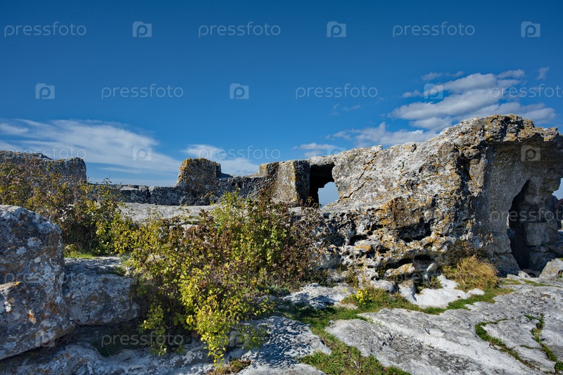 Вид на полуразрушенные горы с вершины полуразрушенной каменной крепости знаменитого города Мангуп-Кале V века в Бахчисарайском районе